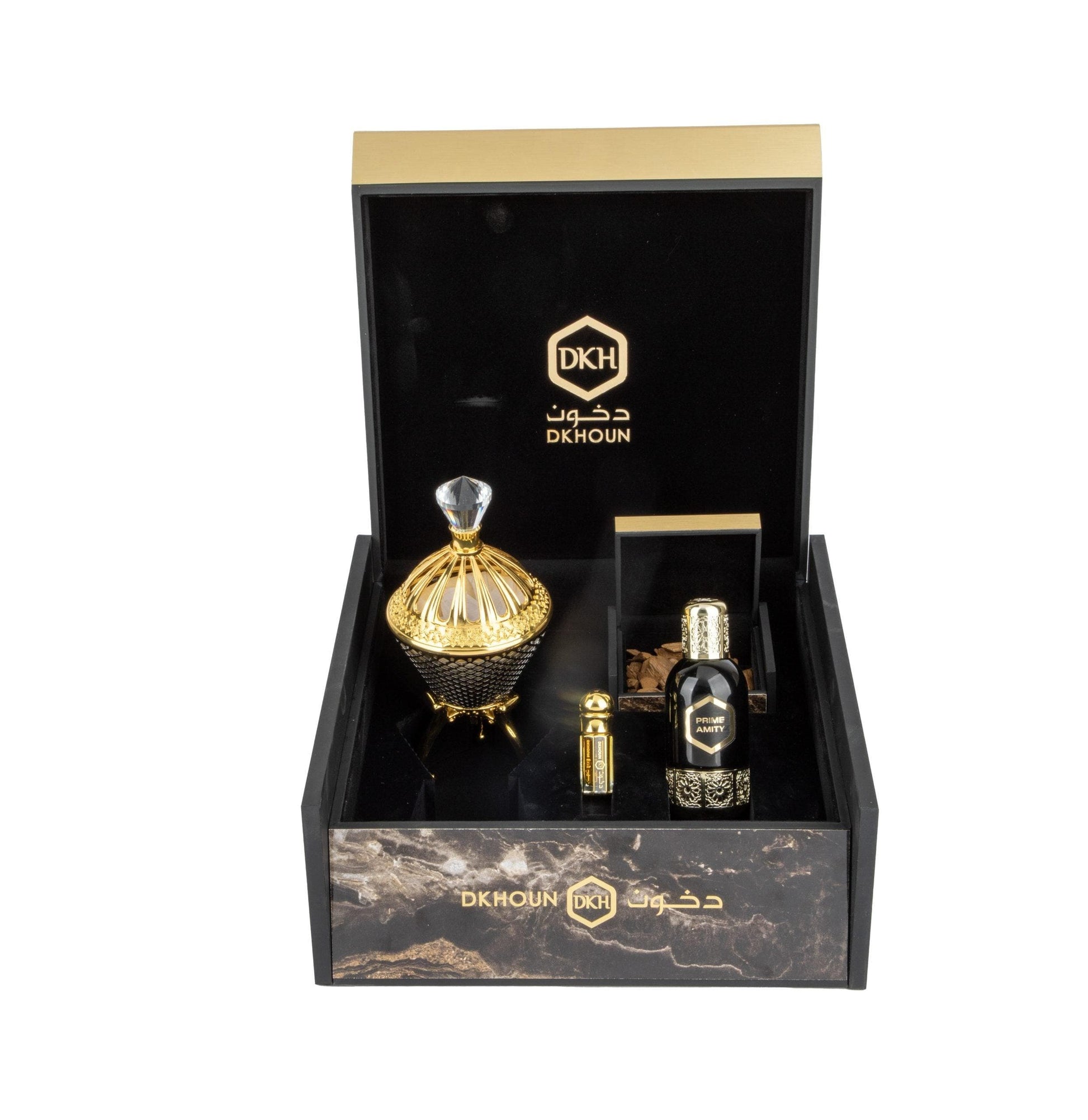 عطر أميتي هو مزيج ساحر يجمع بين النعومة والجاذبية، حيث يفتتح برائحة دافئة من جوزة الطيب ممزوجة برقة الورد الأبيض ولمسة حلوة من الفانيلا، مما يمنح البداية إحساسًا أنيقًا ومميزًا