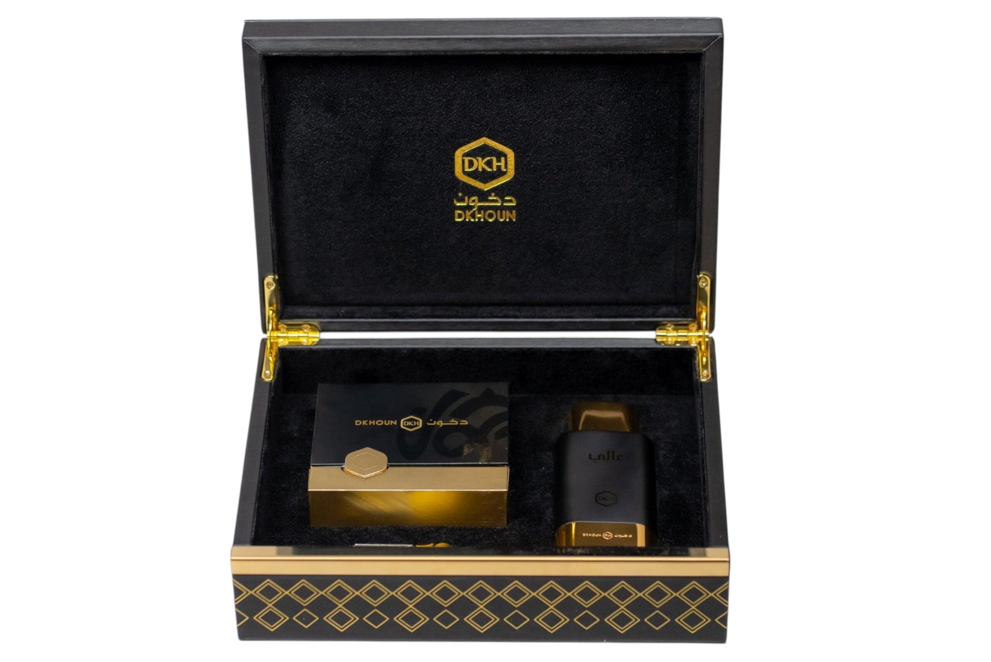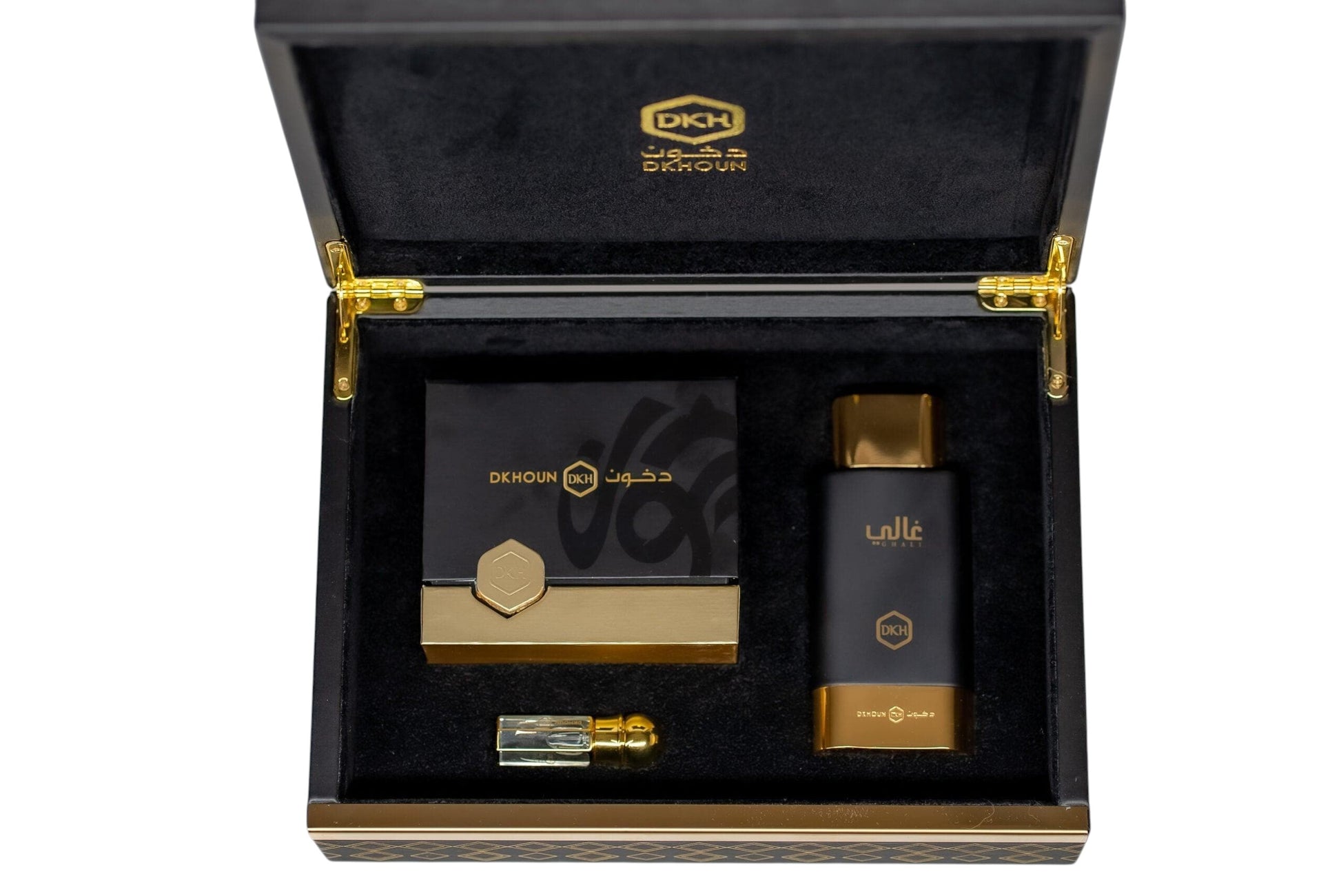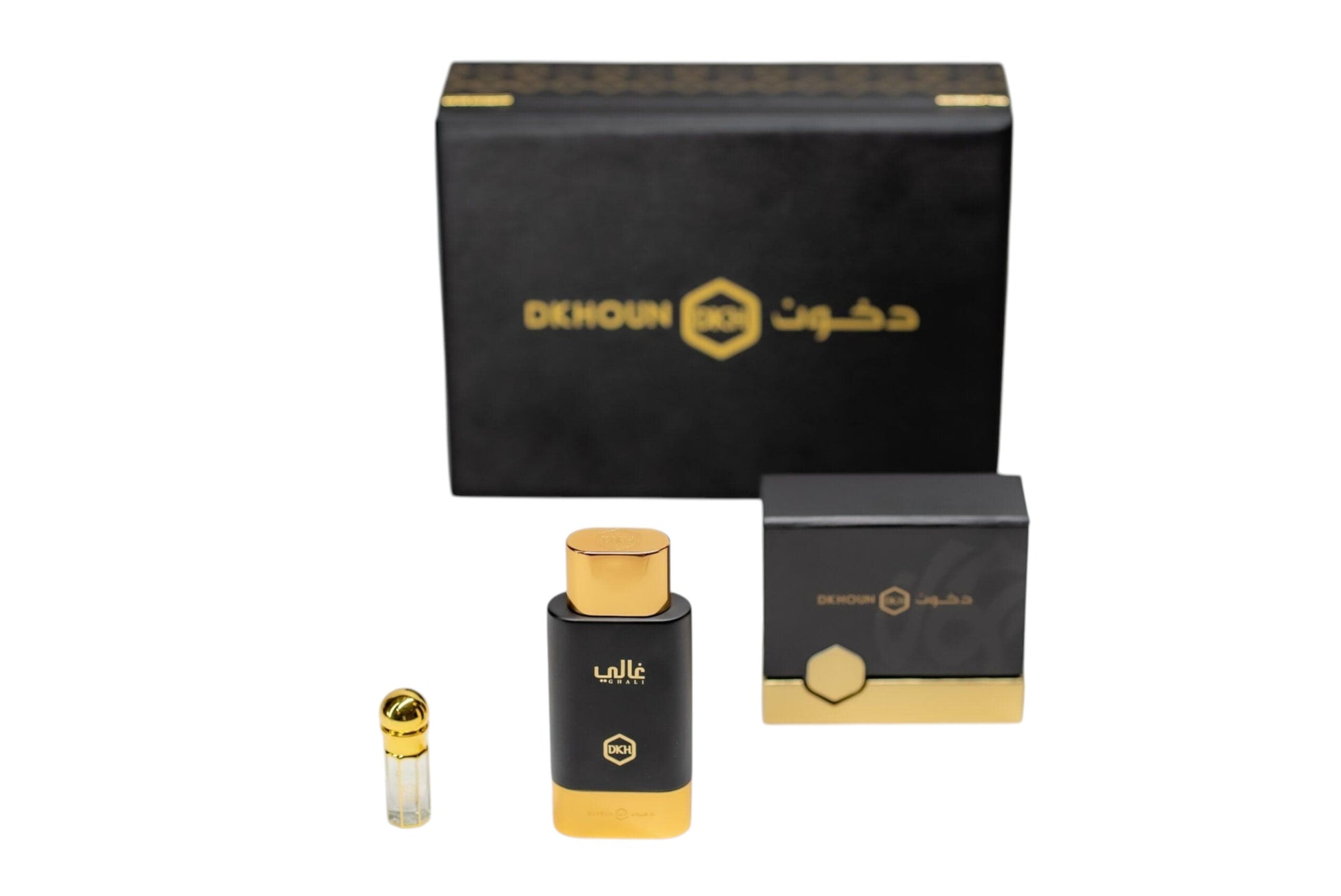 يتكون بوكس اسود غالي من ربع تولة من المسك الابيض، و من عطر غالي من العطور الاكثر وكذلك يحتوي على اوقية من بخور الفارس الاكثر مبيعا في دخون كسر العود المسقاه والعنبر والازهار