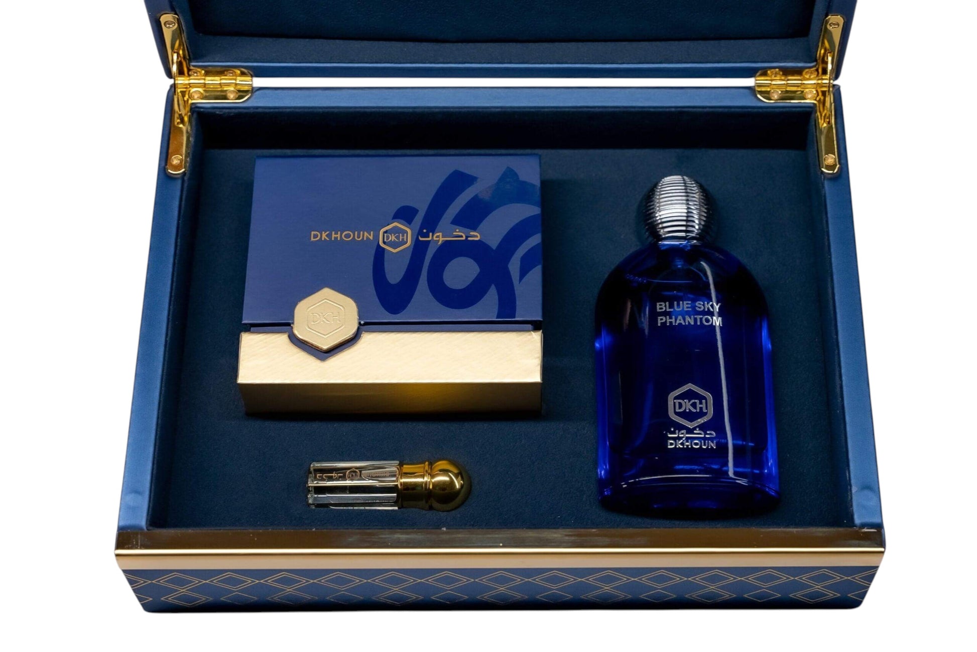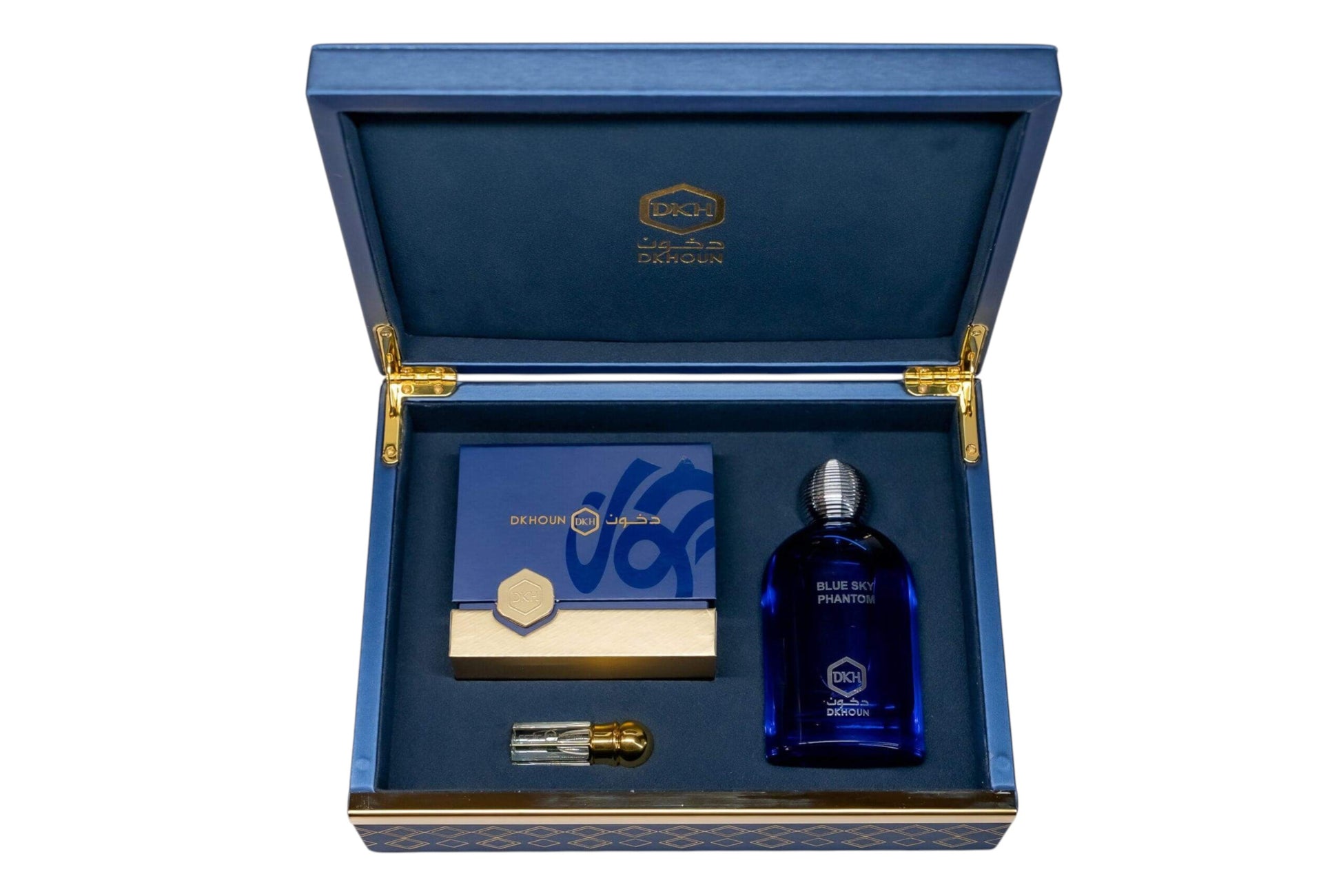 يتكون بوكس ازرق بلو سكاي فانتوم من ربع تولة من المسك الابيض، و من عطر بلو سكاي فانتوم من العطور الاكثر وكذلك يحتوي على اوقية من بخور الفارس الاكثر مبيعا في دخون كسر العود والعنبر والازهار