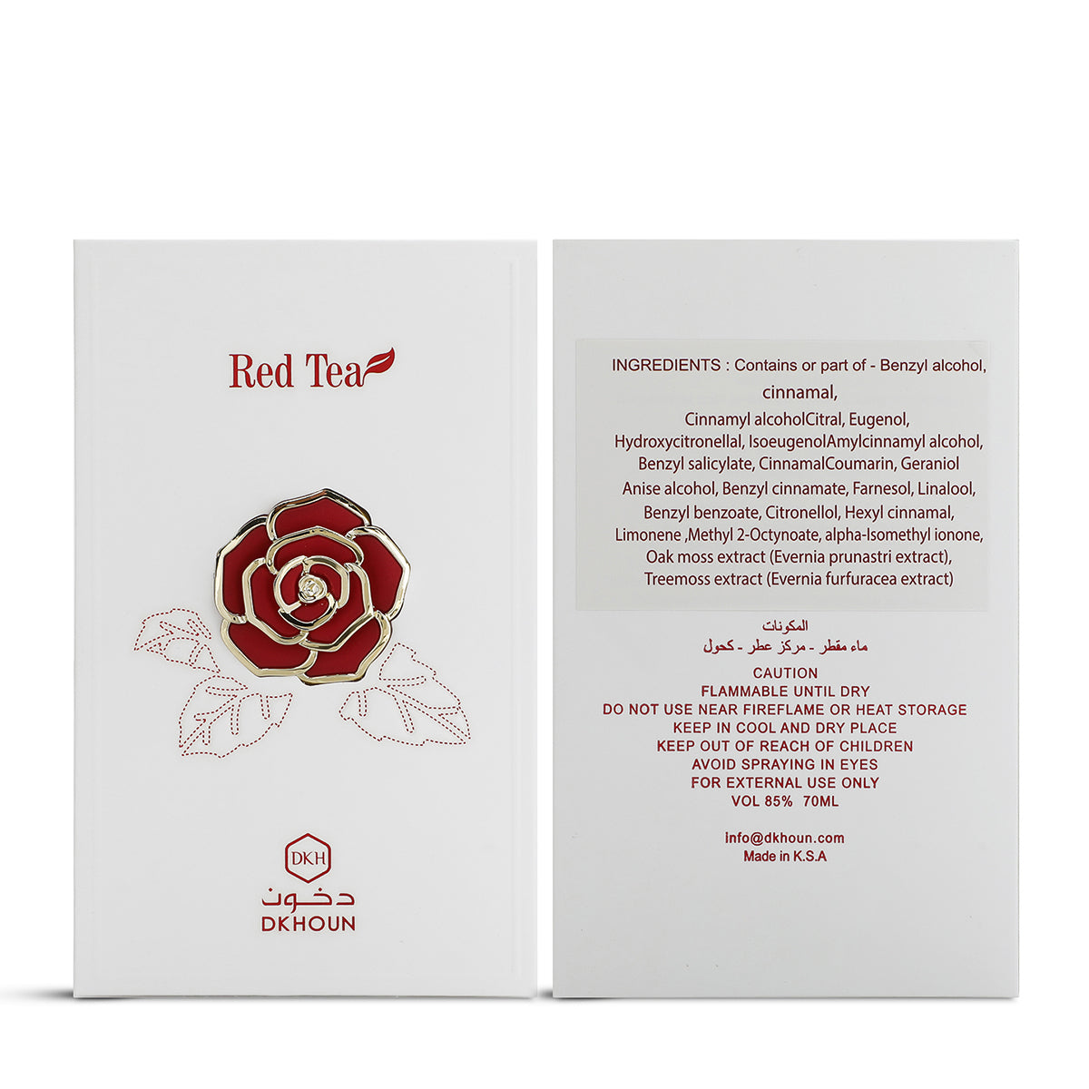 عطر الشاي الأحمر هو عطر فاخر وفريد من نوعه، يمزج بين توابل الهيل الدافئة والبرغموت الحمضي، والفواكه المجففة وزهرة السوسن والشاي الأحمر النقي، والعنبر والمسك الحلو. يتميز هذا العطر برائحة دافئة وناعمة ومثيرة تجعله مثاليًا للاستخدام في المناسبات الخاصة.